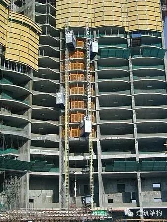 哈利法塔工地的另一种起重设备是附着式升降机,用来运送建筑材料和工人。这个工地有14台附着式升降机在运行。