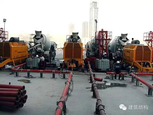 在哈利法塔工地上,有3台高压泵,将混凝土输送到工人操作的高处。面临的一个挑战是,将高强度的混凝土输到570m以上的高度,并且不影响混凝土的基本性能。