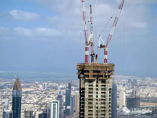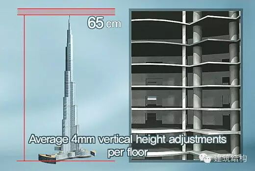 由于哈利法塔建成之后的重量达到500000t,会出现下沉的趋势。所以在建设过程中,每一层的实际高度比设计高度高出4mm。