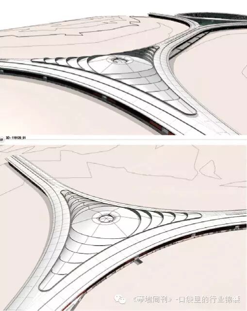 幕墙玻璃尺寸由5m*2m(长*宽)的超大梯形板块组成,玻璃配置为双夹胶中空;幕墙钢横梁与总包竖向曲型钢结构(Bana n aTruss)相连作为幕墙结构;空侧航站楼幕墙为体量最大的幕墙系统,在主体钢结构立柱之间采用9米跨度的铝横梁,结合竖向不锈钢吊杆作为幕墙支撑结构。这样的设计,既满足了横梁的挠度变形要求,又使幕墙系统的视觉效果显得通透轻盈。