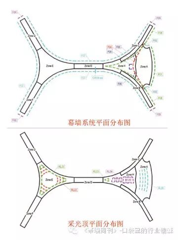 单元体及全隐框梯形截面构成,约20000平方米,位于机场A区,航站楼南主入口处,总宽度382米,幕墙高度39.8米;单元体幕墙玻璃为双夹胶中空HS8+1.52PVB+FT6+16AR+FT6+1.52PVB+HS8,单元体板块宽4.8米,高2米,重量达800公斤,水平曲面保持单元体宽度不变,靠单元体二边隐框梯形截面幕墙边部铝板变化调节,竖向曲面由单元体组成折线变化,隐框梯形截面幕墙由三角形玻璃尺寸变化组成(建筑师称为香蕉束)双夹胶中空玻璃HS8+1.52PVB+FT6+20AR+FT6+1.52PVB+HS8。三角形隐框玻璃为变化彩釉玻璃,由下到上变化。该部分幕墙支撑点在主钢结构圆钢管桁架上,通过三维可调节转接件连接。幕墙面为双曲面,在施工图阶段进行三维放样,确定坐标点,铝板及三角玻璃都要空间放样确定尺寸。