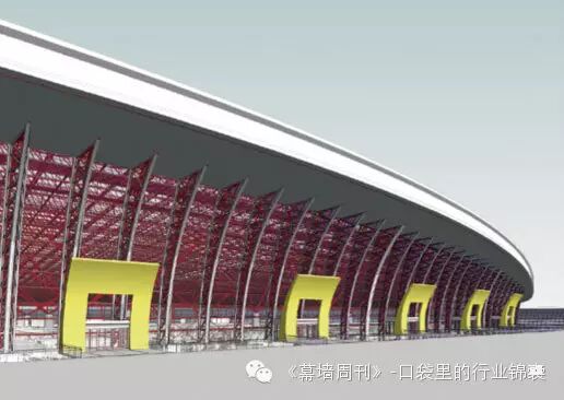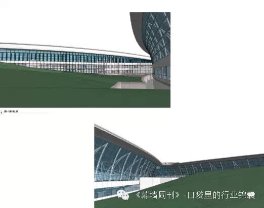 幕墙位于A区,航站楼左右二侧,主要是隐框幕墙,圆形面,双夹胶中空玻璃HS8+1.52PVB+FT6+20AR+FT6+1.52PVB+HS8,顶部钢桁架支持幕墙,幕墙面积3500平方米。