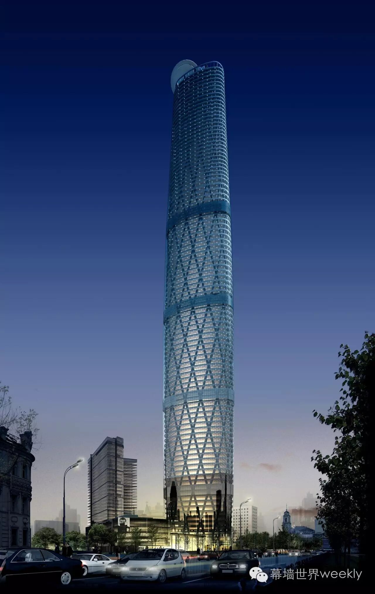 建筑标高600米(国内第一高塔),全球第一座双水槽曲面单元式异型幕墙,建筑面积11万㎡,幕墙面积4万㎡。在世界超高层建筑发展历史中具有里程碑意义。外表面为椭圆平面缩放与旋转而形成的空间曲面。幕墙板块由三角形的玻璃单元及四边形蜂窝铝板单元组成,每个板块大小、尺寸均不相同,安装在花栏状外钢筒与功能层楼板边缘之间,安装位置精度高,钢梁穿过幕墙面防水难度大,主体结构位移大,局部位移复杂。其设计、施工难度都是属于世界顶尖级的。