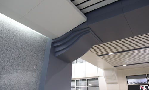 为了确保富阳站作为富春山水中的江南驿站的建筑立意,站房建筑外檐口造型采用加长铝单板,檐口铝板长度4.8m,原设计采用1.5m宽板,为了保证吊顶铝板的平整度,将吊顶板的宽度优化为0.75m,密拼板缝。在对应幕墙立柱分格模数处吊顶采用铝条勾勒线条,檐口根部的细部收口用现代手法和工艺来体现当地(龙门古镇,即孙权故里)传统建筑元素。