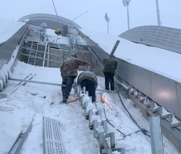 格栅踏步施工时,张家口已经进入了雪季,每天开工前厚厚的积雪都将现场覆盖得严严实实,团队都要先扫雪除霜,然后才能正常开始施工。
