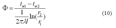 式(10)在形式上仍遵循热电比拟关系,其中的分母即圆柱体的一维导热热阻表达式。圆筒壁按单位管长而不是按单位导热面积来计算热流密度是适宜的,也比较方便和适用。人们常把这时的“热流密度”记作 ,单位是W/m,有