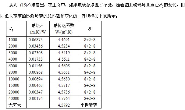 (1)相同厚度和组合的圆弧玻璃与平板玻璃的综合传热系数是不一样的,其规律是圆弧直接越小,其值越小,不过总的说来,差别不大。即玻璃系统的总传热系数主要与其结构和材质有关。